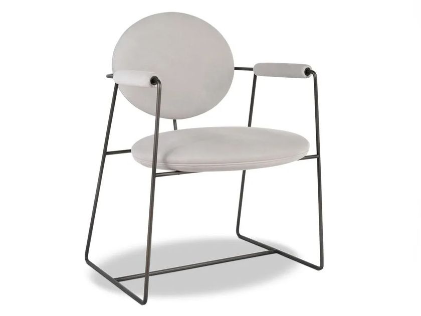 Versatile and distinctive, this vintage-inspired chair creates an atmosphere of refined elegance, thanks to the interplay of solids and voids between the backrest and the armrests, between the soft padding and the sturdy metal rod frame.