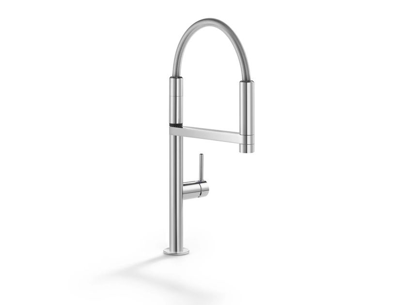 Move redesigns the professional sink mixer tap, simplifying its line (the bridge supporting the shower head is replaced by the outlet spout itself) and revolutionising its concept: the frontal position of the centre of rotation, opposite to the traditional sink taps, doubles the range of action of the mixer tap, while the magnetic attraction of the shower head provides a completely smooth support surface, facilitating extraction and use, even with just one hand.