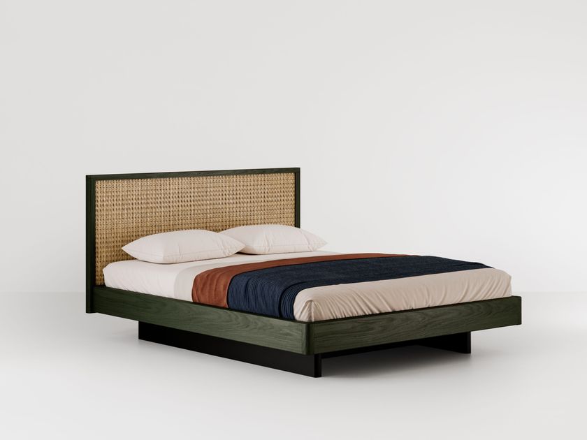 La testiera, disponibile sia nella versione in midollino intrecciato che in tessuto imbottito, accoglie e